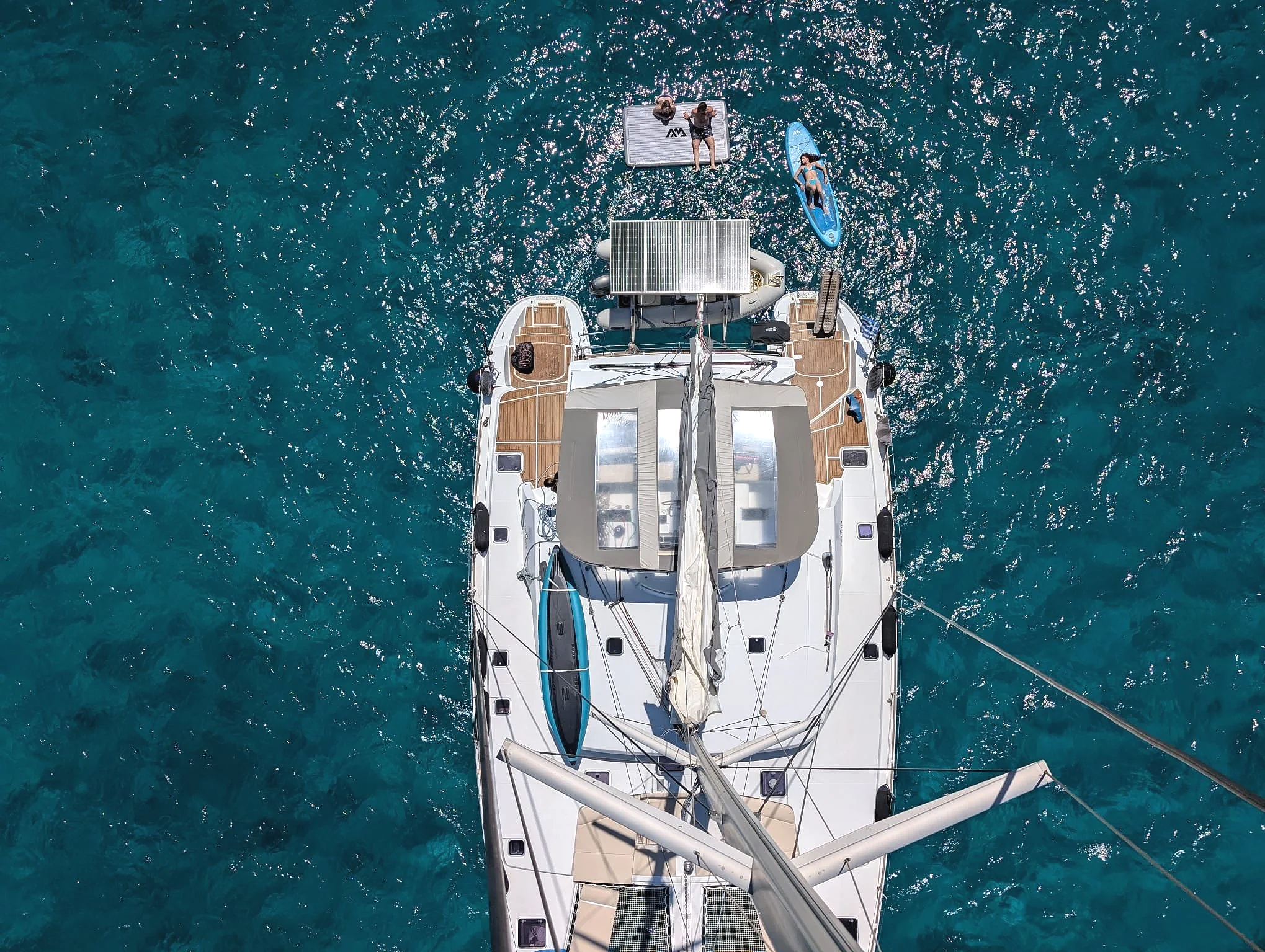 Twin Pride is a Lagoon 500 built in 2010 and majorly upgraded up until 2023. 15.5 meters long and 8.5 meters wide, her clean, sleek exterior surely stands out in the bays of the Mediteranean. She is equipped with all the extras to provide ease, convenience and fun whilst onboard.